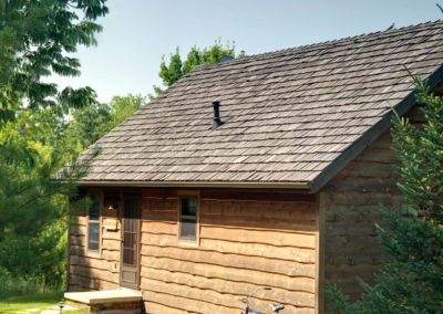 This romantic, one bedroom cabin features a gorgeous cathedral ceiling, accented by hand-hewn oak beams. The Tamarack has a massive, four poster, king sized bed, double whirlpool tub and gas fireplace. A covered porch, which faces towards our wildlife pond, is an excellent place to dine alfresco or watch the stars at night. Make the Tamarack Cabin your “home away from home” in Door County!